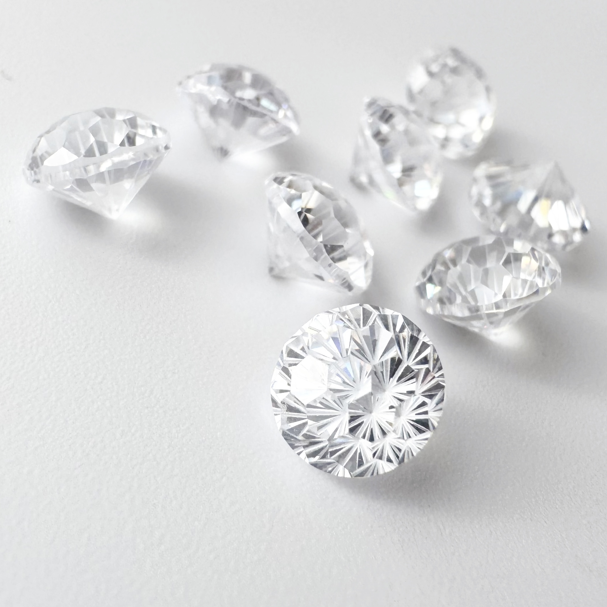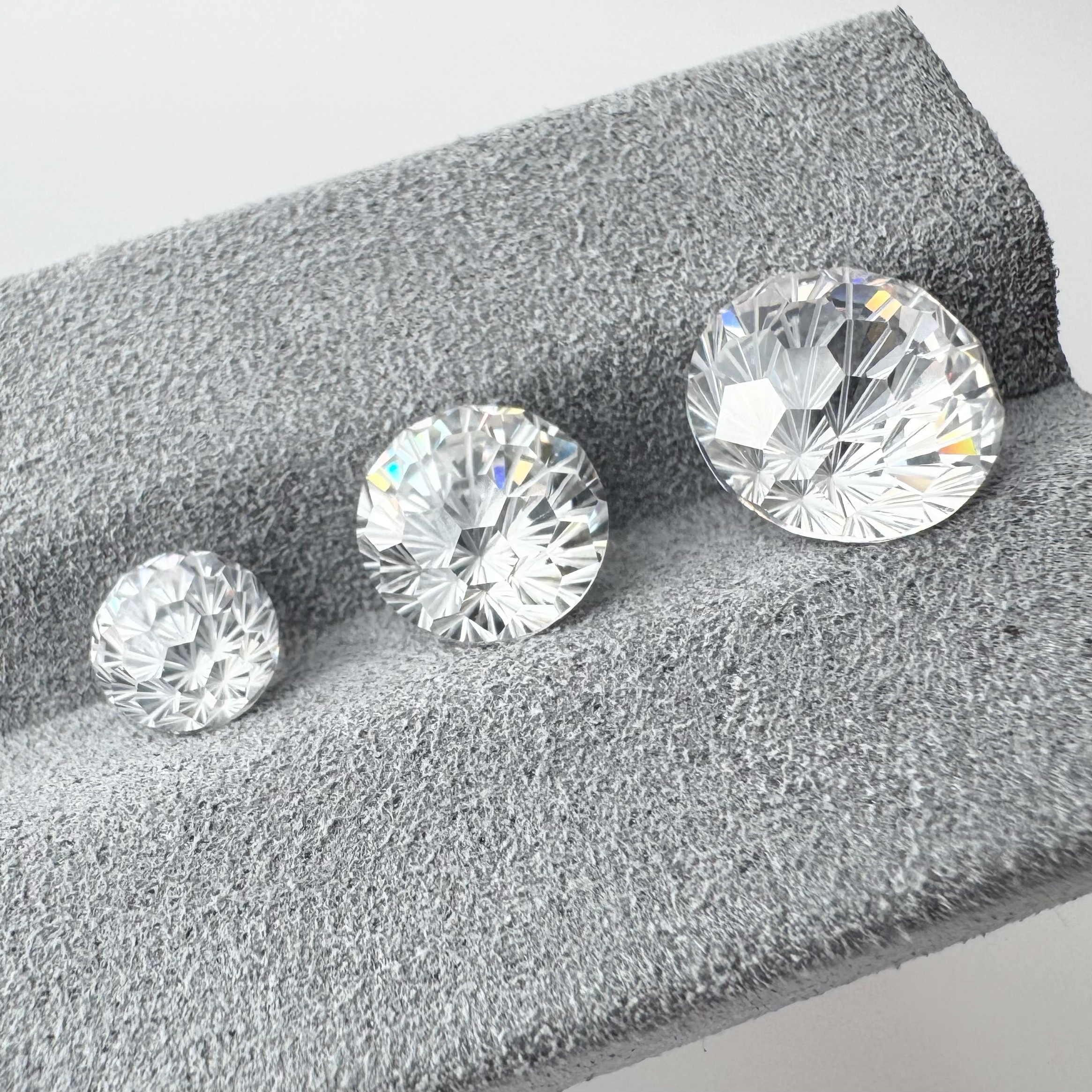 花火カット(CZ)は、中心から放射状に広がる多面構造を持つカットジルコニア素材です。光の入り方や角度によって、万華鏡のような繊細な表情の変化を見せます。