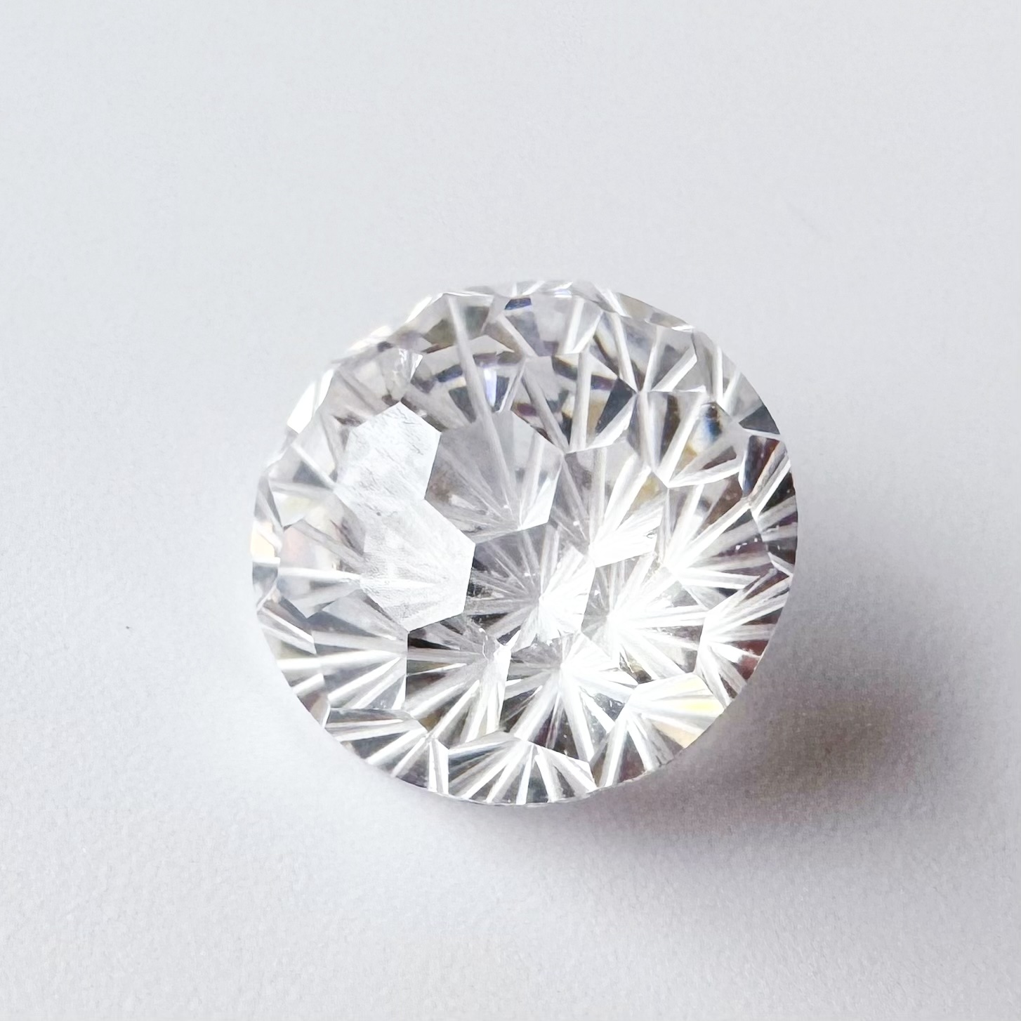 花火カットの放射状の多面構造が光を美しく反射し、角度によってさりげない虹色のきらめきを見せます。